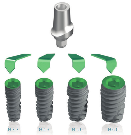 Conexiune protetică unică pentru toate diametrele, Ø 3.7, Ø 4.3, Ø 5.0, Ø 6.0.