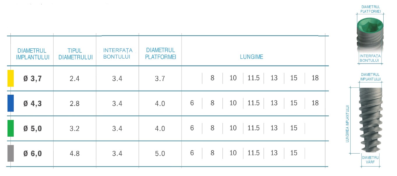 Implantul dentar JDEVOLUTION® PLUS+ este disponibil în diametrele și lungimile prezentate în acest grafic: